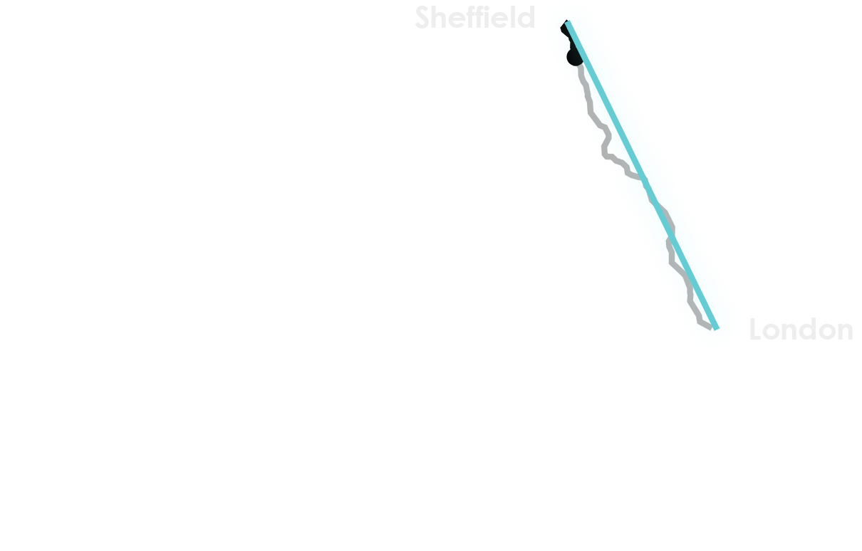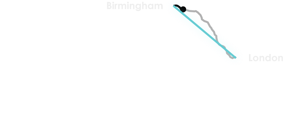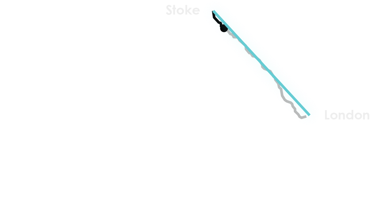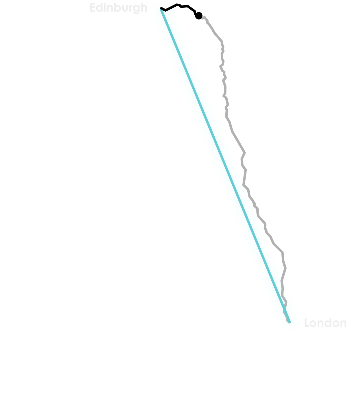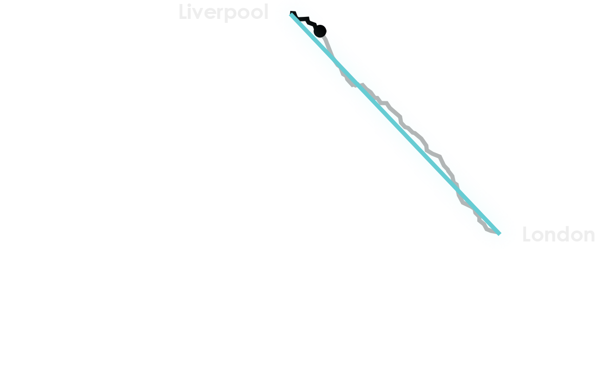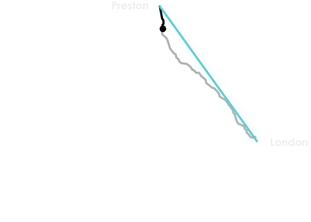 Distance train would have travelled by the time the Hyperloop reaches London. Train distance travelled when Hyperloop reaches London